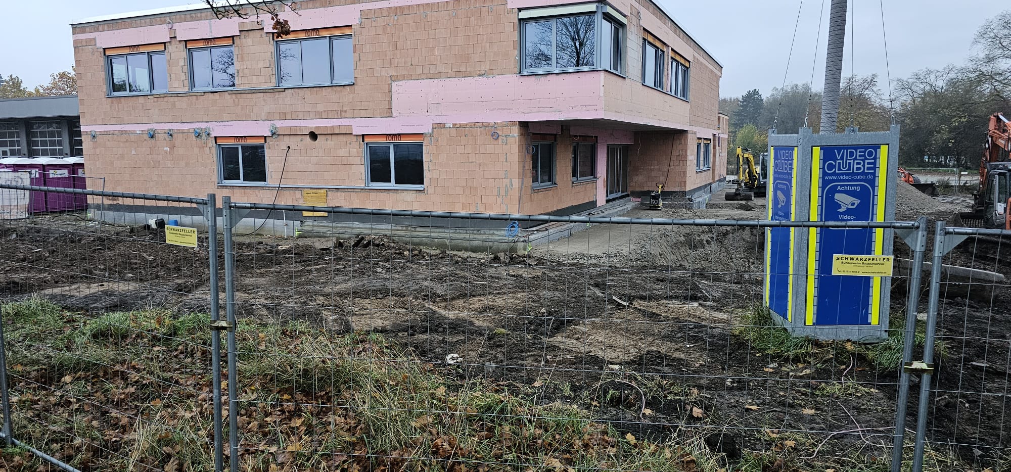Die ersten Innenwände der Fahrzeughalle sind hochgezogen. Außerdem wird von der Garage bis zum Fahrradweg ein Graben für die Wasserleitung gegraben.